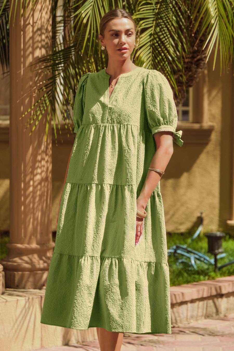 Textured gingham babydoll midi dress with short puffed sleeve with tie cuff.