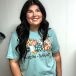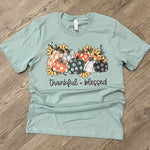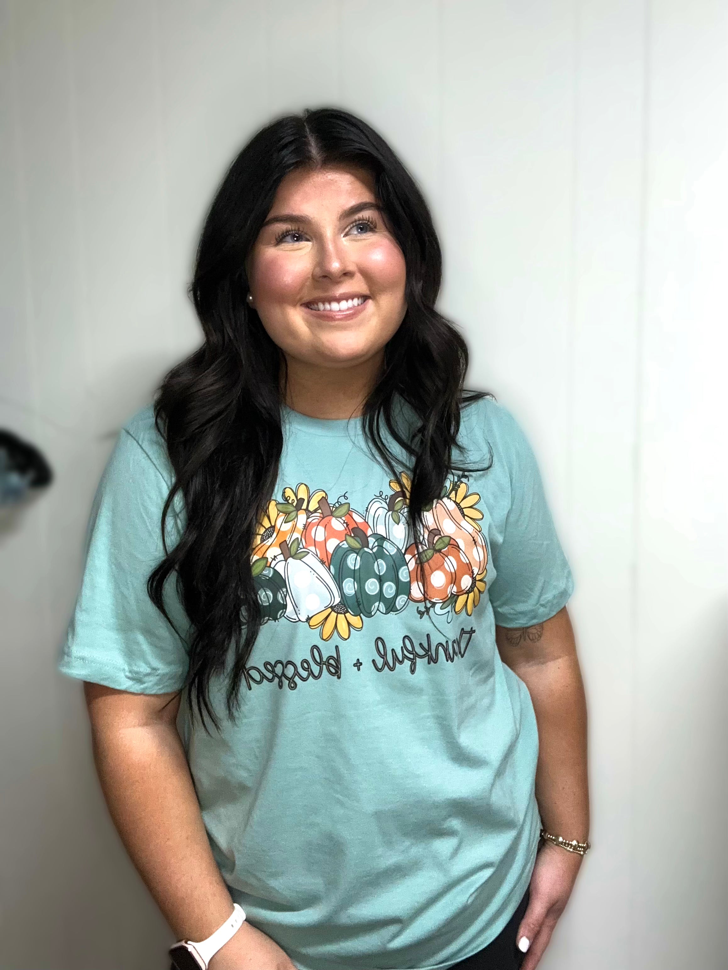 This Thankful & Blessed Short Sleeve Tee is the perfect combination of style and comfort. Crafted from high-quality material, this tee features polka dot pumpkins paired with the phrase 'thankful and blessed' for a look that stands out. The classic dusty blue hue adds a touch of sophistication. Enjoy stylish comfort all season long.