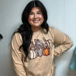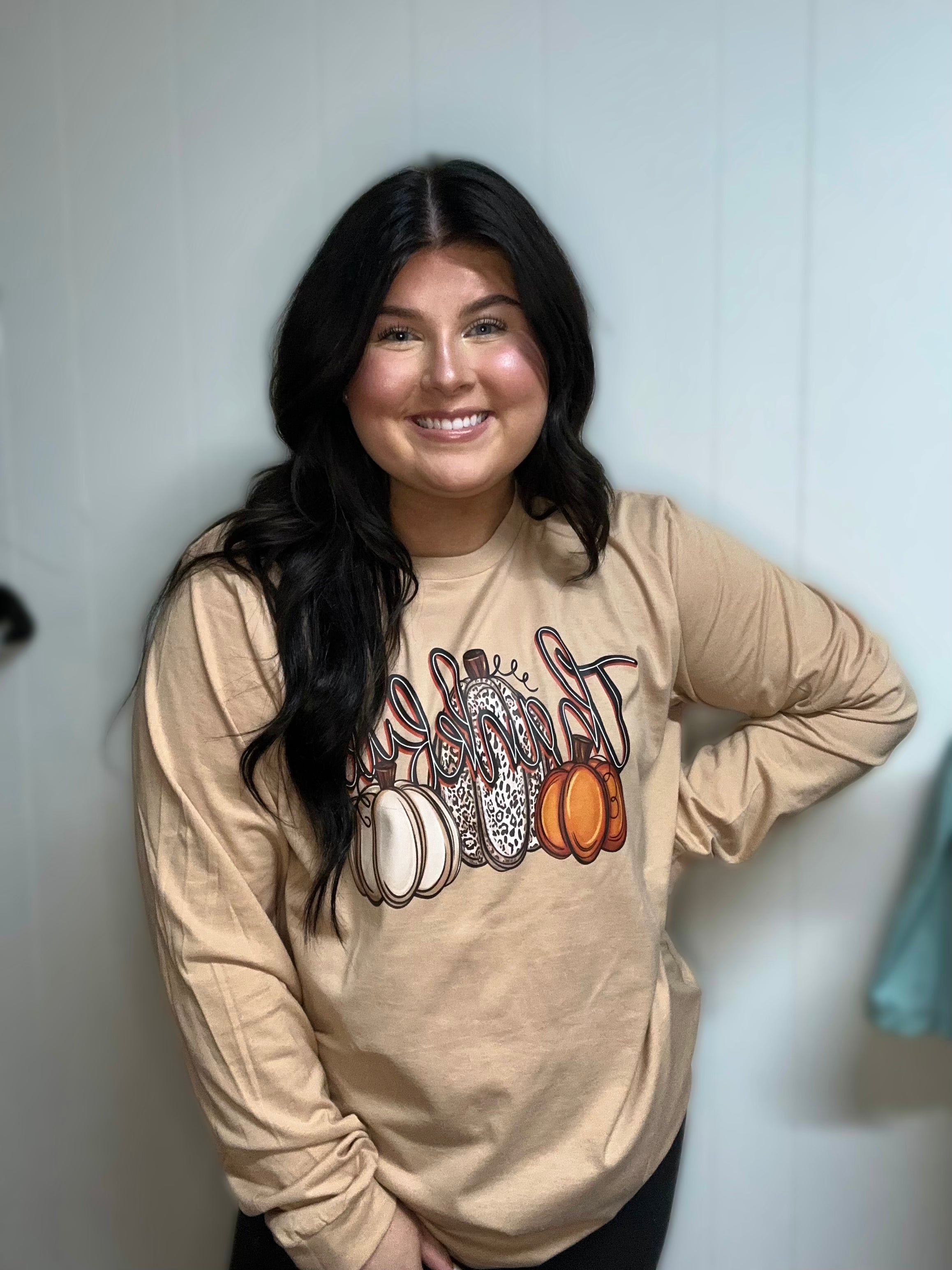 Give thanks this autumn with the Thankful LS Tee. This long-sleeved Bella Canvas shirt features three pumpkins screen-printed on a warm peach color, making it perfect for cooler weather. Get into the spirit of Thanksgiving and show your appreciation for the season.