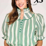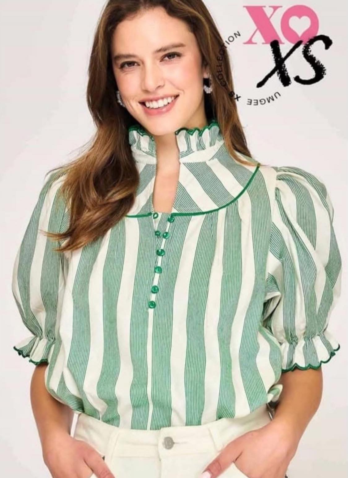 Meet your new favorite preppy top! The Sutton Stripe Blouse is full of classic charm with its green vertical stripes, standing ruffle collar, and scallop-trimmed puff sleeves. The neckline features functional green buttons for an extra pop of color and detail. With its relaxed, cling-free fit and easy pull-on style, it pairs perfectly with denim, trousers, or shorts. Bonus—it's also available in blue!