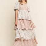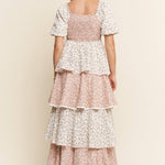 Soft, sweet, and oh-so-feminine—our Blushing Blooms Tiered Maxi Dress is everything you want in a romantic look. Featuring alternating tiers of tiny floral prints in blush and cream tones, this dress is full of twirl-worthy charm. The square neckline and smocked back offer a flattering and comfortable fit, while the wavy ric-rac trim adds just the right touch of vintage detail. Whether you’re headed to brunch, a baby shower, or a Sunday stroll, this beauty brings all the charm.