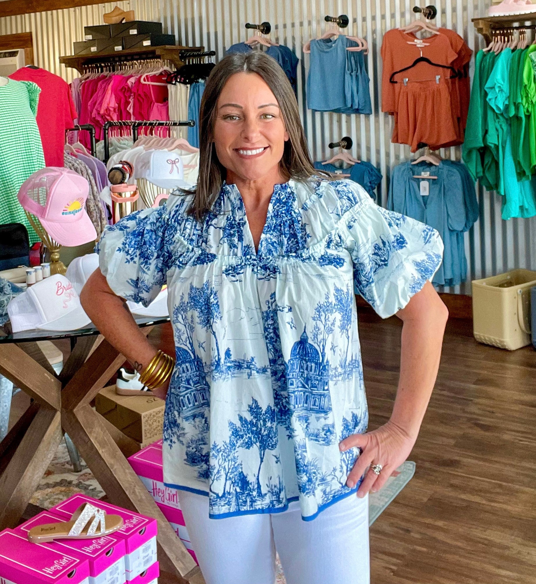 Add a touch of elegance to your wardrobe with our Toile Print Ruffle Neck Top! This boxy cut top features a beautiful toile print, a ruffle neckline with shirring, and a contrast hem. Available in sizes Small-Large, this top is perfect for any occasion and will make you feel confident and stylish.