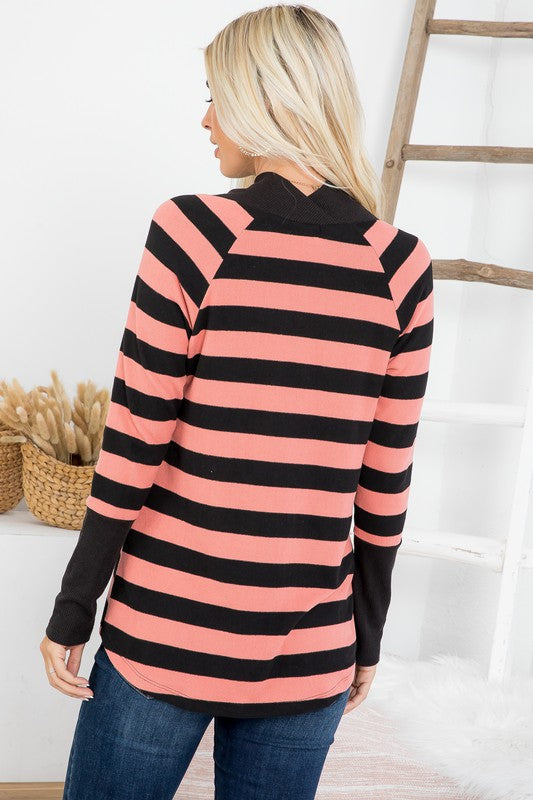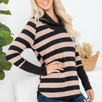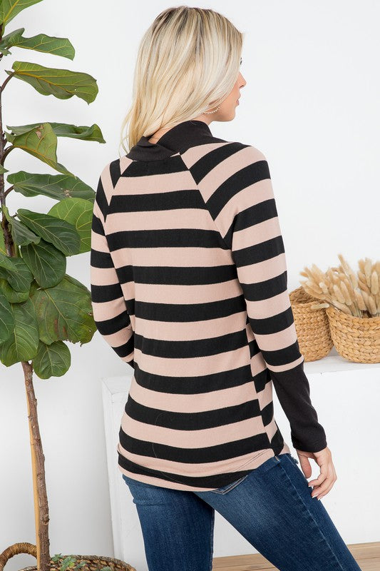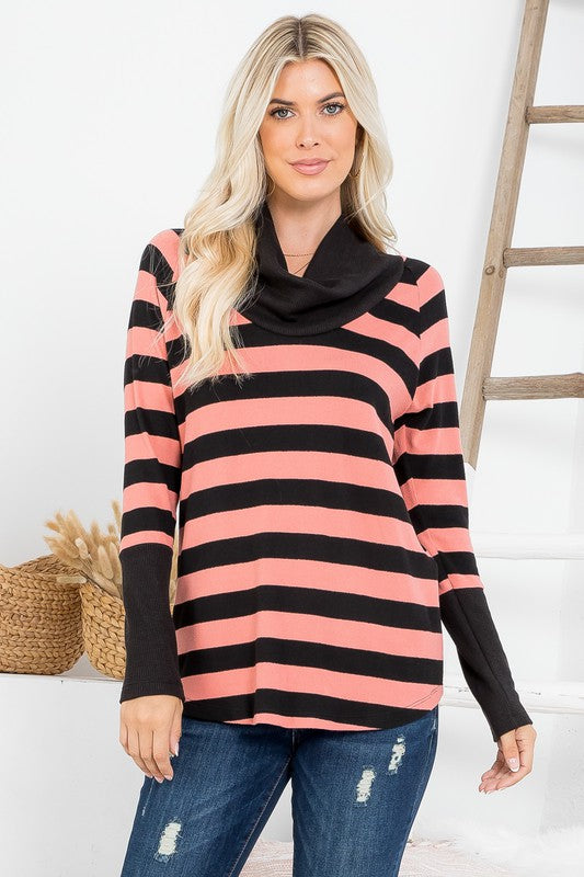 This Trendy Stripe cowl neck sweater is perfect for chilly days. Crafted from soft and lightweight fabric, it has an allover striped pattern that creates a slimming effect. The cowl neckline adds a modern touch to the look.