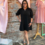 This black Umgee dress is the perfect blend of relaxed style and subtle edge. Designed with tiered layers and a raw hem finish, it creates a flowy, flattering silhouette that’s both comfortable and effortlessly cool. The folded short sleevesadd to its casual charm, making it an easy go-to for everyday wear.