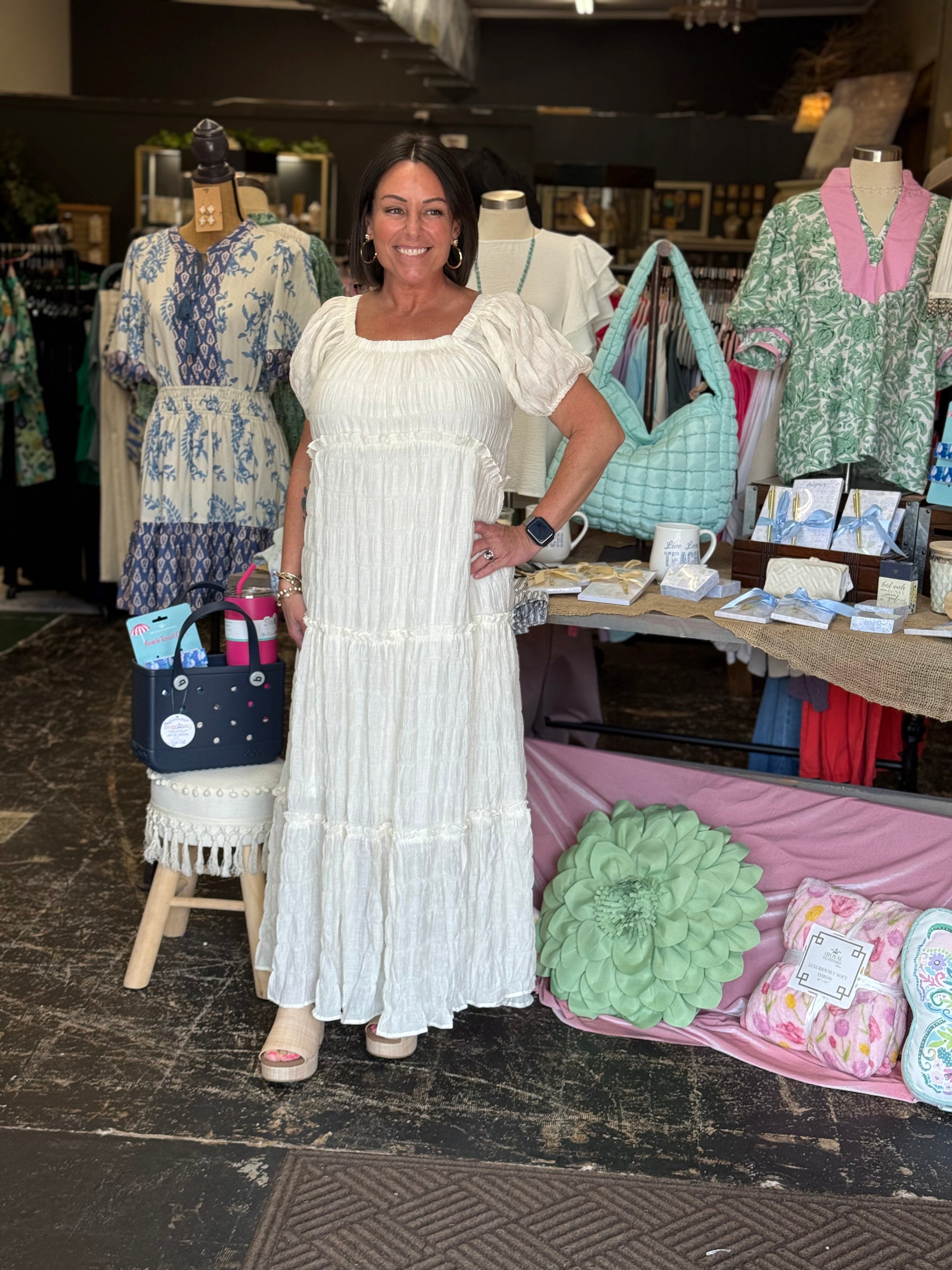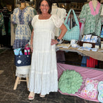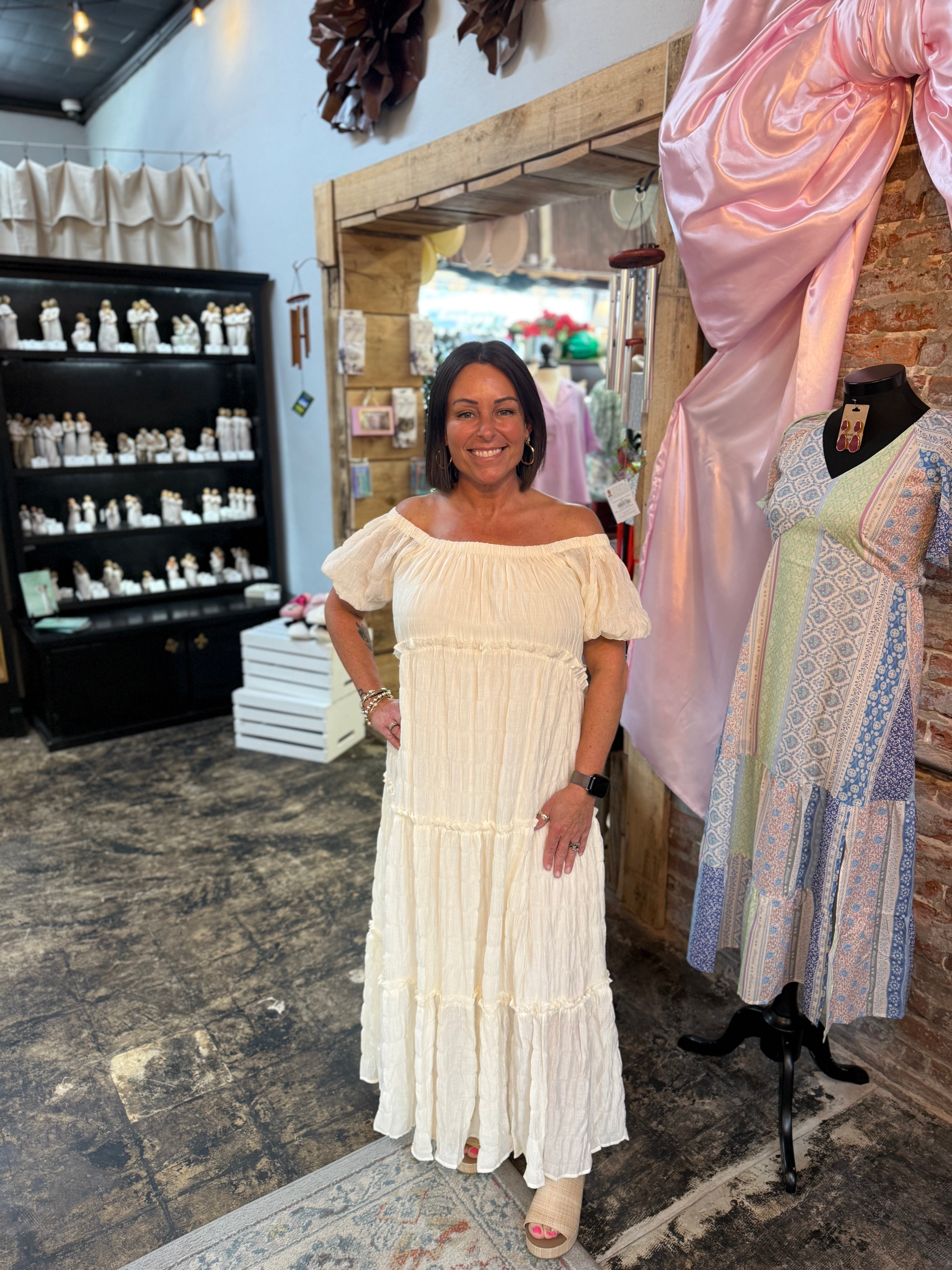 Meet your new favorite boho-inspired maxi dress! This cream-colored Umgee dress features a dreamy tiered silhouette that flows beautifully with every step. The lightweight, crinkled fabric adds texture and movement, while the puffed short sleeves and scooped back neckline bring a soft, feminine feel.