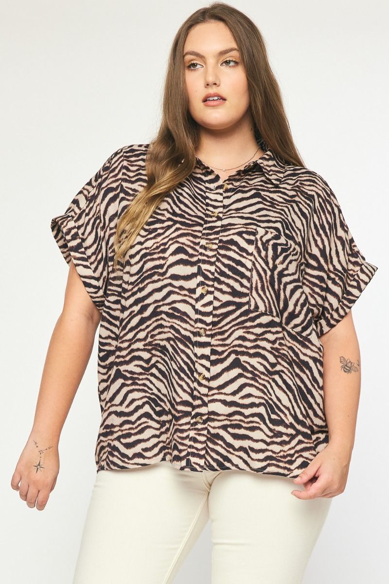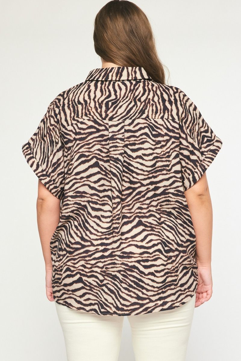 Wild About You is a fashionable animal print top for women. With its collared neck, pocket detail at the bust and permanent rolled cuffs, you'll be turning heads wherever you go. Made from a lightweight, woven fabric, this top comes in sizes XL to 2XL and is perfect for those wanting an effortlessly stylish look.