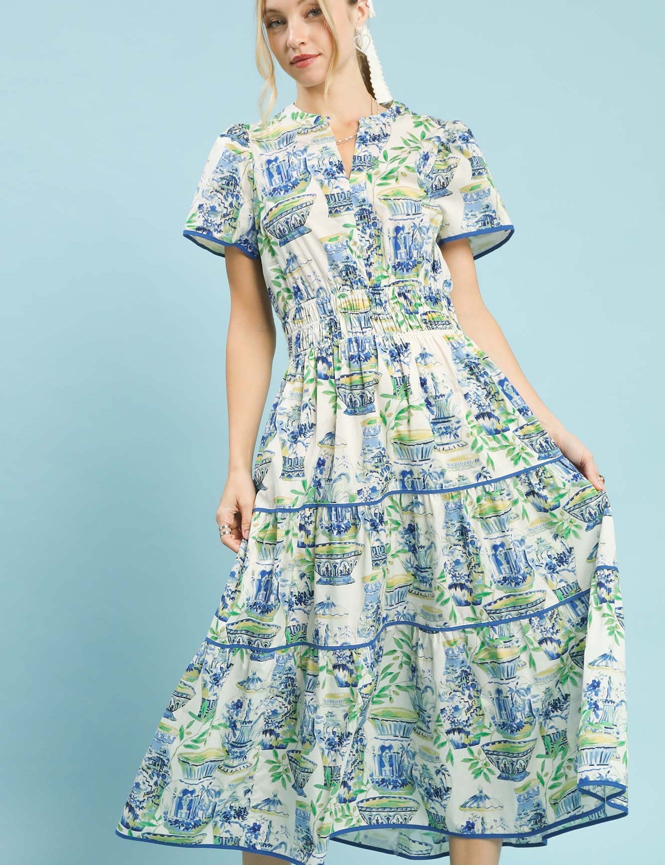 Blue Mix Abstract Print Tiered Midi Dress
