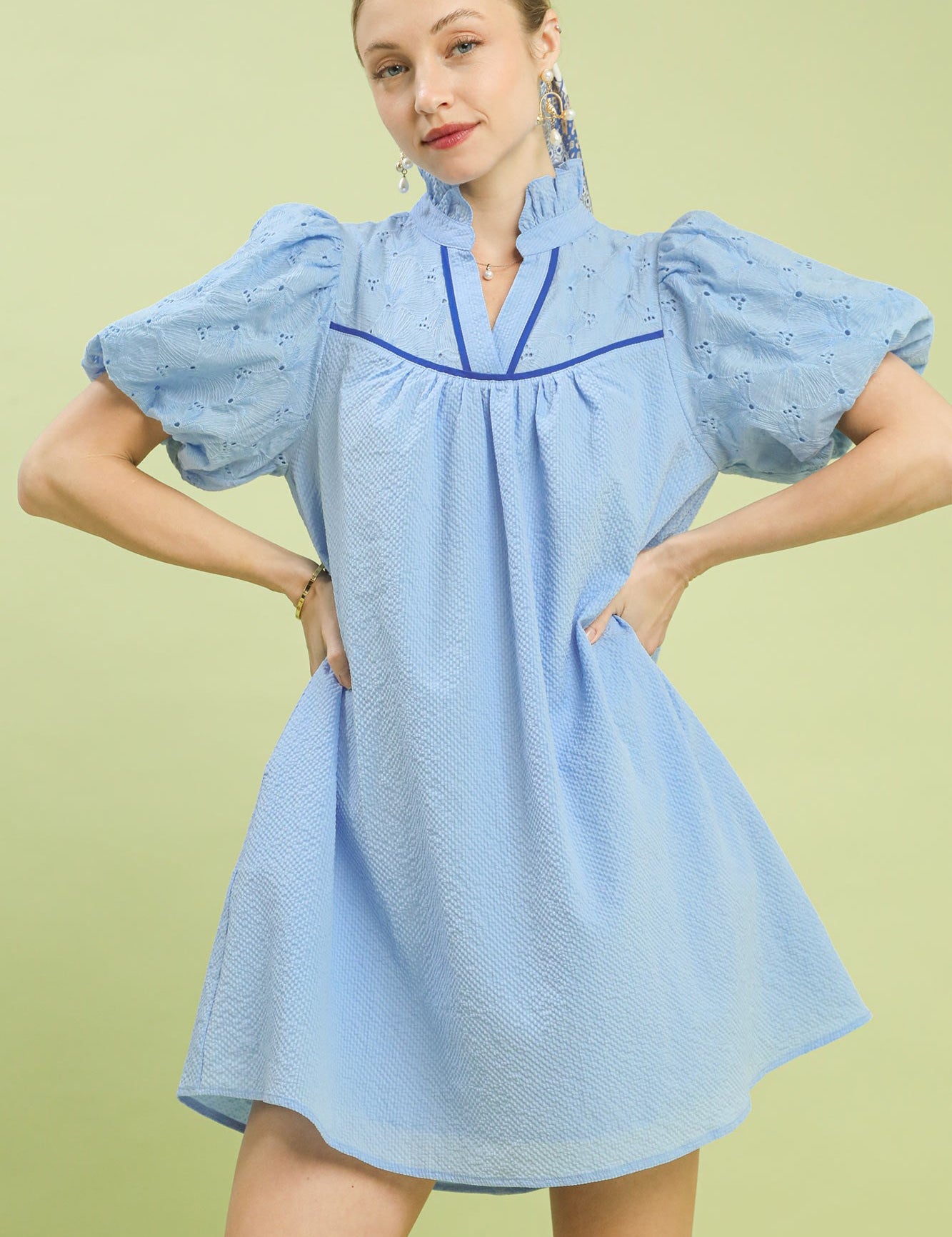Sky Blue Puff Sleeve Textured Babydoll Dress