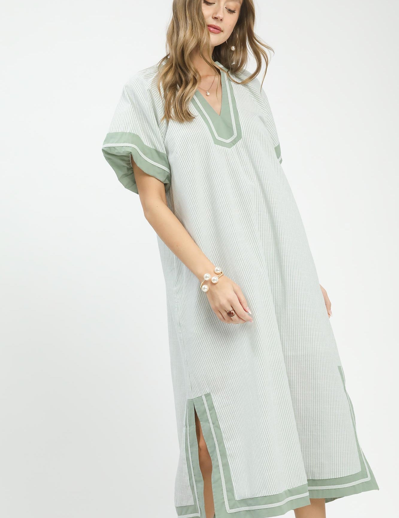 Sage Pinstripe Contrast Trim Midi Dress