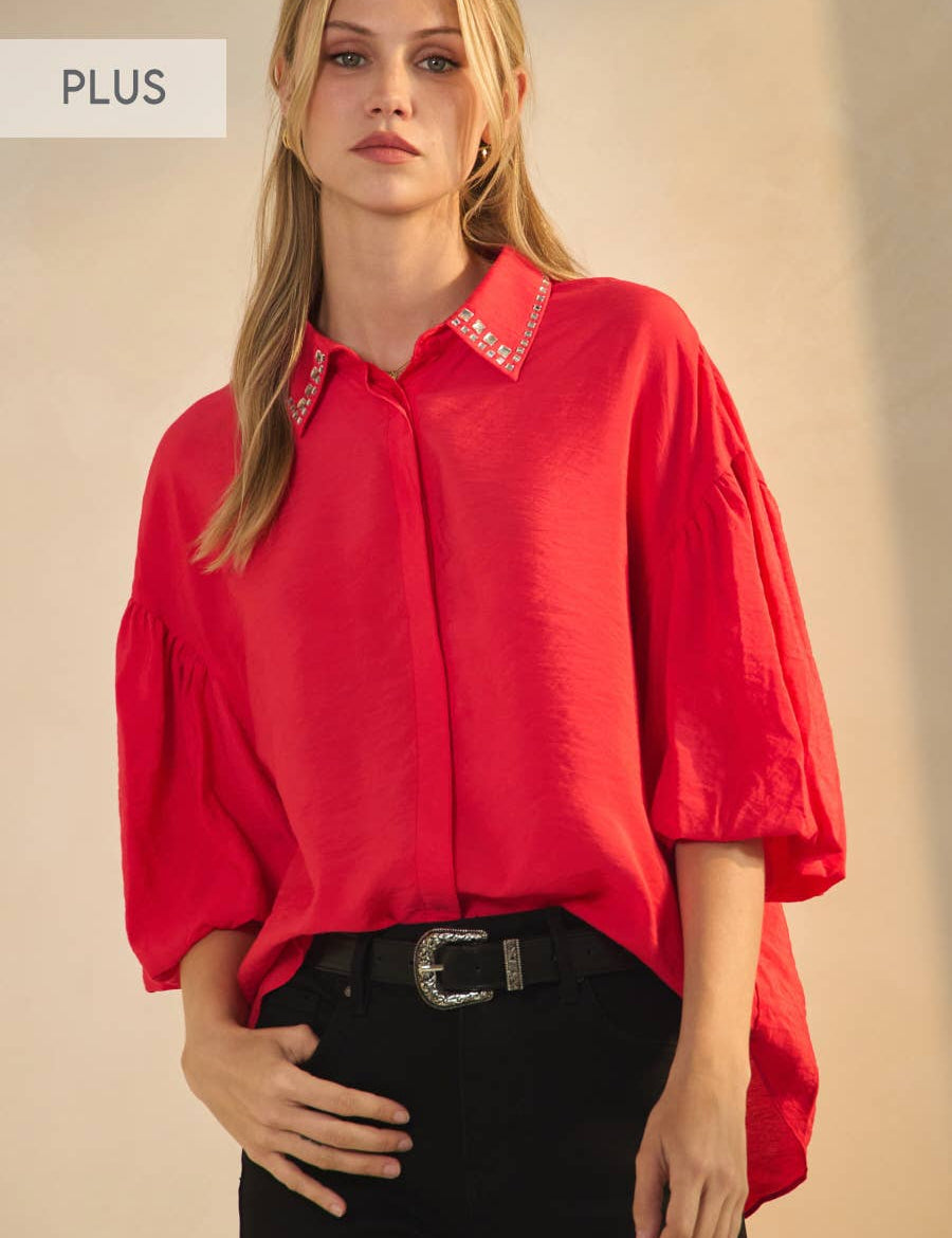 Plus Textured Red Short-Sleeve Blouse with Pearl Collar