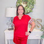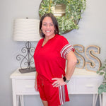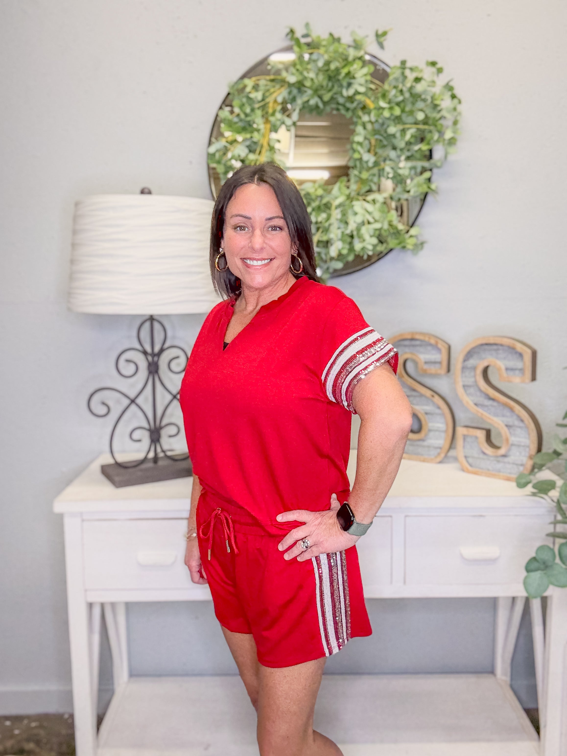 Show off your Alabama pride with the ultimate game day set that’s equal parts comfy and fabulous! This bold crimson red matching set features a v-neck top with sequin stripes in Alabama-inspired colors — red, white, and silver — across the sleeves. The shorts bring the sparkle too, with sequin side stripes and an adjustable drawstring waistband. Whether you're heading to Bryant-Denny Stadium or hosting the ultimate watch party, this look was made for the Bama girl who loves to shine.