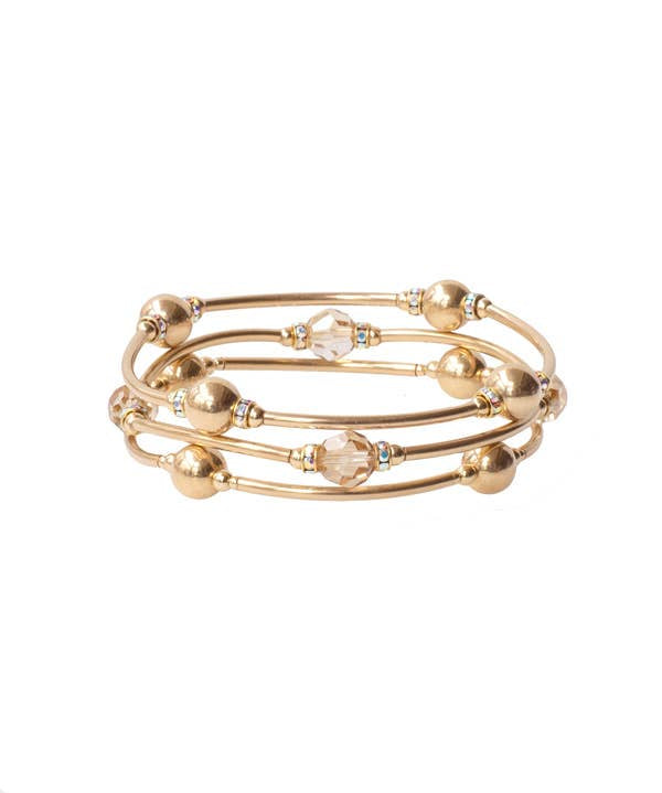 Elegant Gold-filled Gratitude Bracelet; 8 MM crystal Golden Shadow beads with crystal rondelles and Gold-Filled Links, Strung on Stretch Nylon; Standard Size fits most, up to 7" Wrist; Larger size fits up to 8" Wrist All Blessing Bracelets come with a card attached, with the Blessing message, pictured.