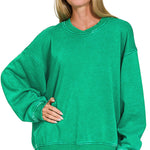 Add a bold pop of color to your casual wardrobe with this acid wash oversized fleece pullover in Kelly Green. Featuring a relaxed fit, dramatic balloon sleeves, and a stylish overlap neckband, this pullover blends comfort with standout style.