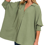 Light, breezy, and so easy to wear—this light olive Airflow Collar Tee is made for warm days and effortless style. The relaxed fit keeps you comfy, while the smocked sleeves and collared v-neckline give it just the right amount of detail.