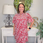 Make a bold entrance in our Amelia Tiger Tail Dress! Featuring a striking crimson and white tiger-stripe print, this breezy silhouette is perfect for game day, brunch with the girls, or casual Fridays at work. The smocked detail at the neckline adds texture and a flattering shape, while the soft bubble sleeves offer just the right touch of femininity.