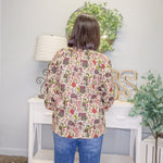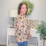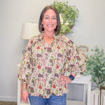 Add a pop of print to your wardrobe with this lightweight stunner! Featuring a split V-neckline, puffed raglan ¾ sleeves, and a scalloped ruffle collar, this piece blends feminine detail with everyday comfort. The flowy fit and breathable fabric make it perfect for layering or wearing solo.