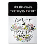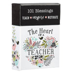 Educators need encouragement just like everybody, and The Heart of a Teacher Box of Blessings will do just that. Share heartfelt and encouraging words and well wishes with all the teachers in your life— people who pour into your children to make a difference.he white body of the Boc of Blessings is topped with a shiny black lid. Heart-shaped floral designs accented with fluttering birds decorate each side of the small box. The title is presented in an informal hand-drawn font.The Heart of a Teacher A subtitle appears in white font on the black lid. 101 Blessings to teach, inspire, motivate.The small cards inside the box cycle through 5 designs that include blue frames, floral swags, floral banners, scalloped frames, and floral bases. Each of the 51 double-sided cards has an inspirational Scripture verse on one side and an uplifting quote or phra