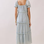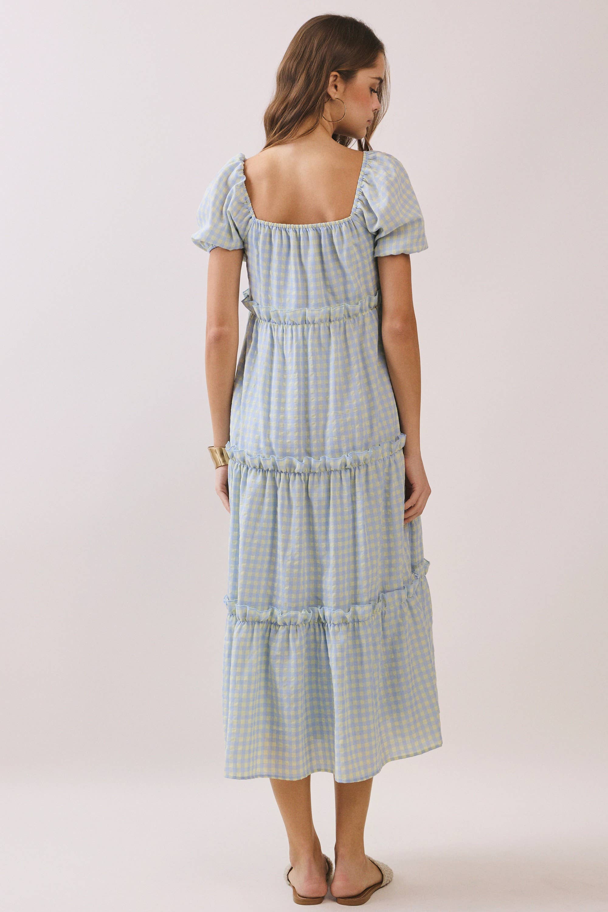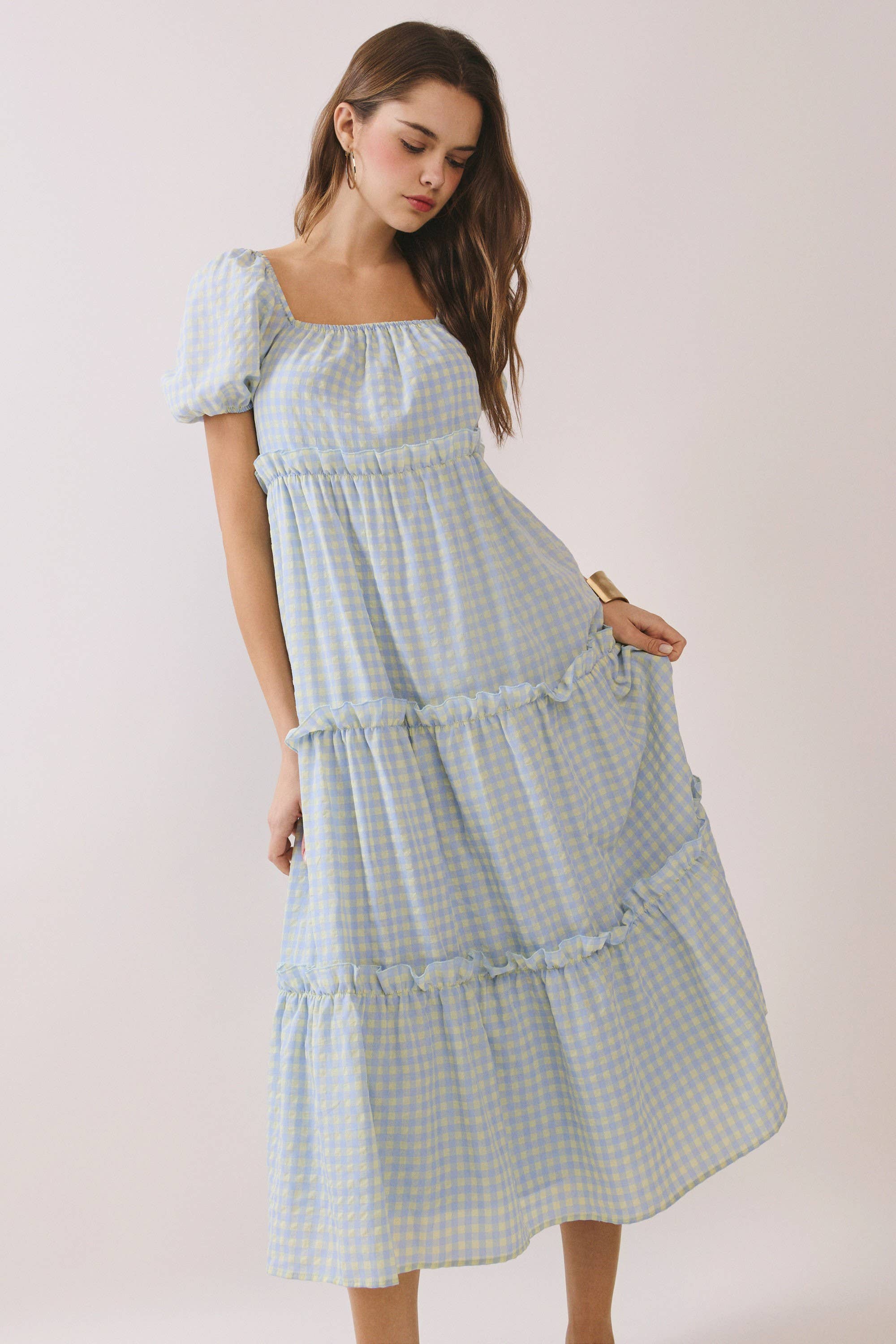 This soft blue and buttery yellow gingham midi features the most flattering babydoll silhouette with a feminine square neckline and darling puff sleeves. The empire waist creates that easy, flowy shape we all love, while the tiered skirt with subtle ruffle detailing adds movement and charm.