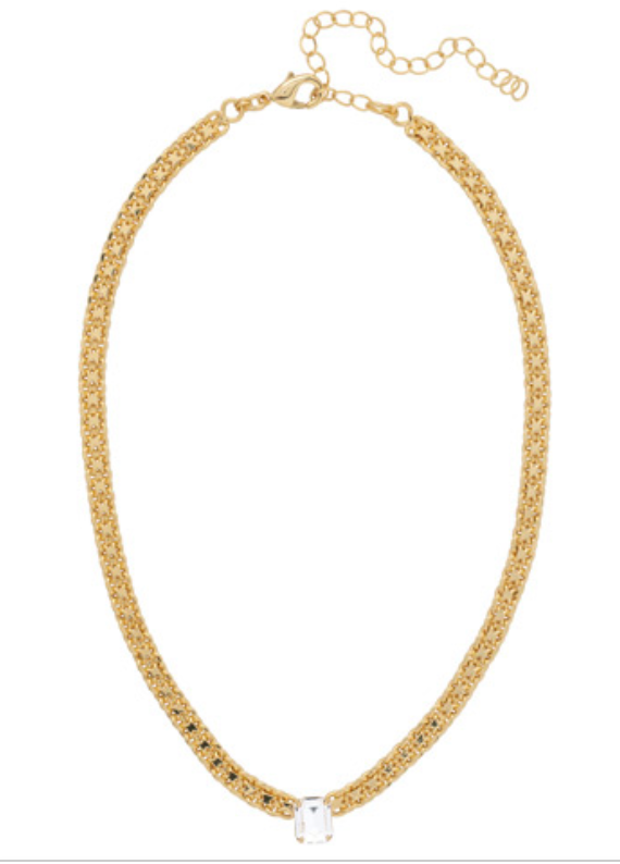 The Octavia Tennis Necklace features a single petite emerald cut crystal on an adjustable chain, secured with a lobster claw clasp.