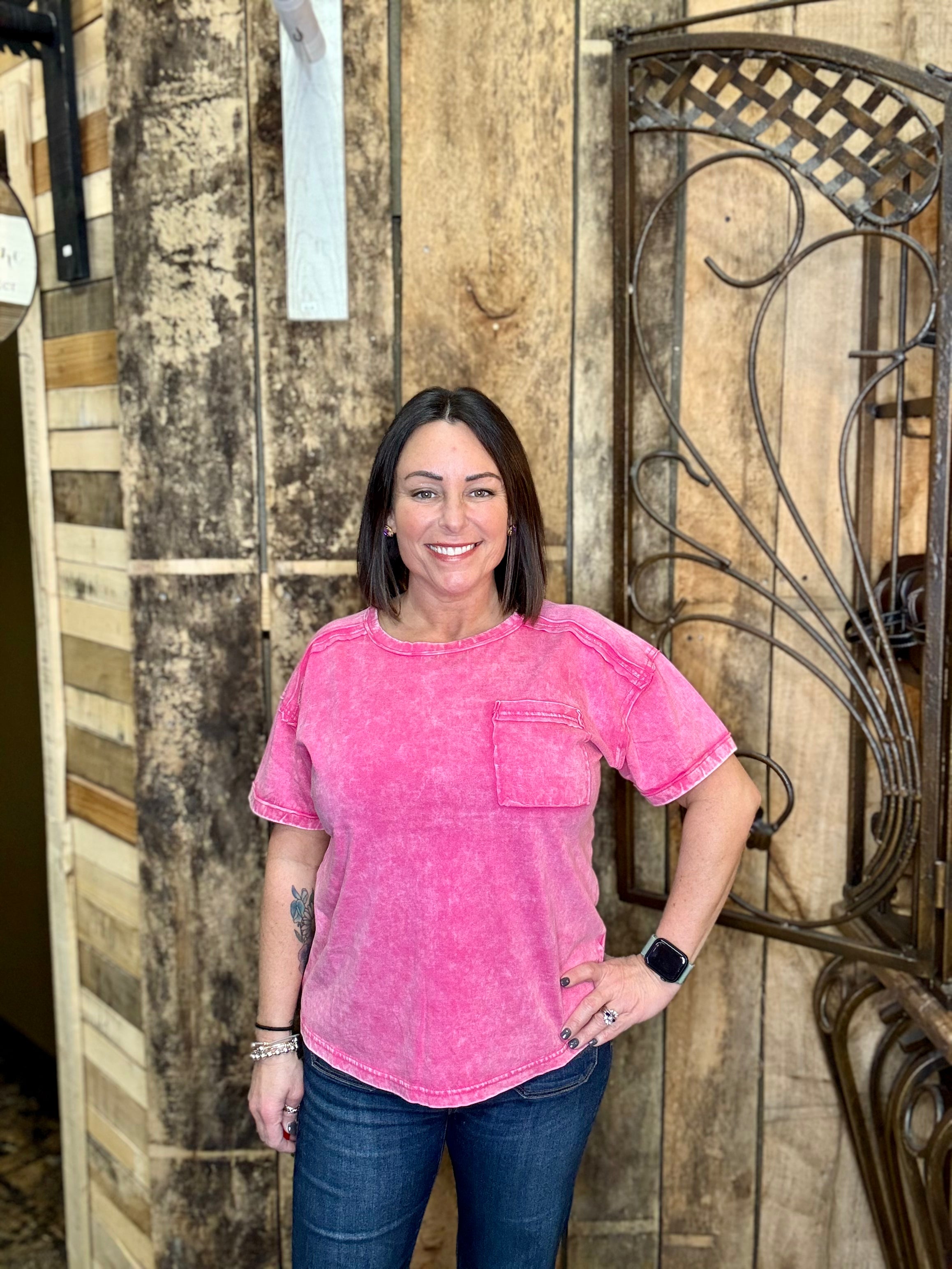 Curvy Hot Pink Acid Wash Round Neck Tee