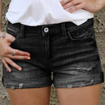 Our black mid-rise distressed denim shorts combine style and comfort in one package. With 5 pockets and button closures, made from 75% cotton, 24% polyester, and 1% spandex.