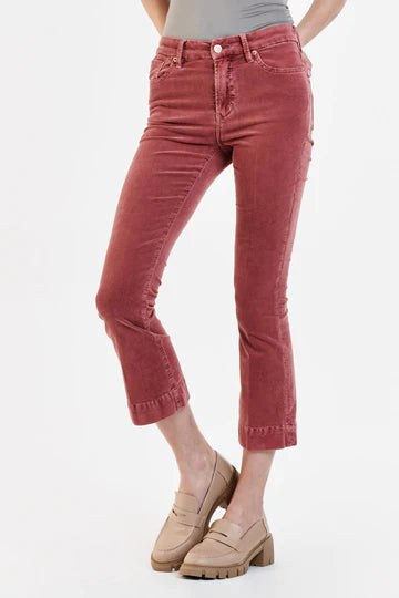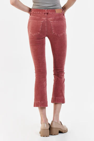 Super high rise cropped flare leg pants. It's the graceful fit that sits at natural waist and fits skinny in the hips through the knee. Cropped inseam on stretch corduroy washed for softness in designer color palettes.