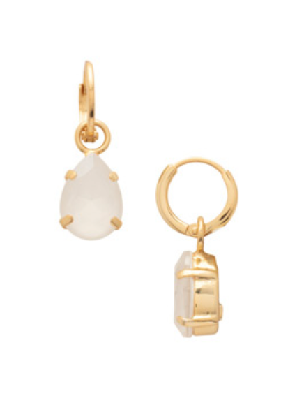 The Perfect Pear Huggie Hoop Earrings feature a single pear-cut crystal on a delicate metal huggie hoop.