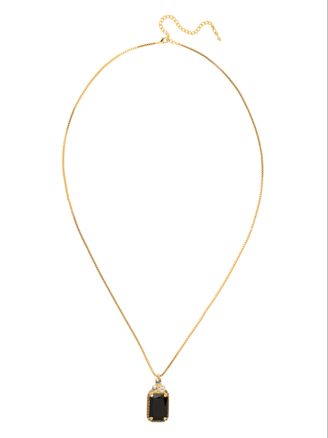 The Izzy Decorated Stud Earrings feature a single imperial fancy square-cut crystal with a metal beaded halo dangling from an adjustable chain, secured with a lobster claw clasp. (16-20 inches)