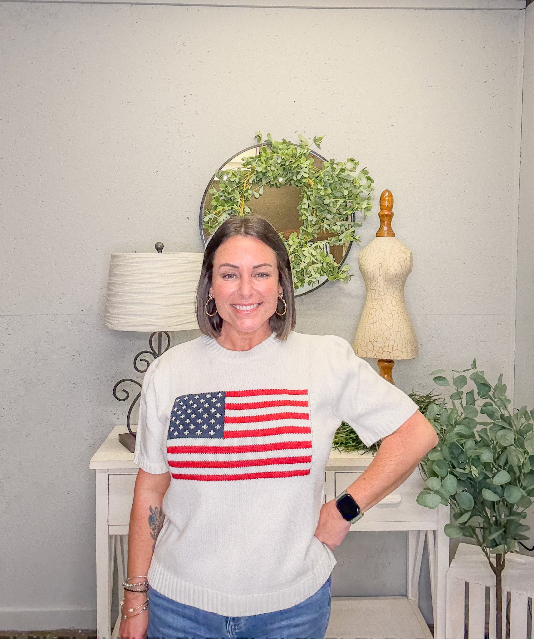 Show off your patriotic spirit in the Stars & Stripes Knit Top! This lightweight, short sleeve knit has a soft, sweater-like feel but is still breathable enough for those sunny summer days. The white base is perfectly accented with a bold American flag pattern across the front—making it a standout choice for cookouts, lake days, or watching fireworks in style.