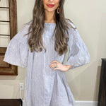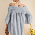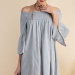 Lilac Bells Tunic- the cutest tunic with 3/4 bell sleeves, made from 100% cotton. Our off-the-shoulder smocked neckline design is a must-have for any fashionista out there! Choose from our sizes Small to Large and never worry about feeling uncomfortable.