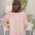 Elevate your everyday look with this Stripe Tiered Blouse, blending caramel, raspberry, and cream hues in a chic vertical stripe pattern. The classic collar and button-up front give it a timeless touch, while the tiered silhouette creates a flattering, feminine shape. With tie details on the sleeves and a flowy fit, this blouse transitions effortlessly from casual outings to polished occasions.