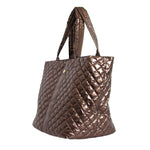 Made of quilted nylon, to zipper and inside zipper on one side and slip pocket on the other. Perfect for everyday user or attach crossbody strap to make this bag great for travel! These tote bags pair perfectly with our Diamond Weekenders and Cosmetics! Dimensions: 20Lx12.5Wx9.5D Detachable striped Strap: 52”