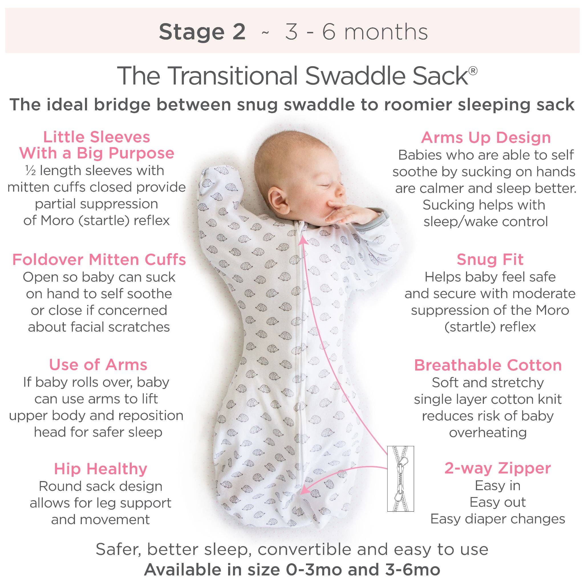 The Transitional Swaddle Sack was created by a nurse and mom of two, and it is so special it has earned a patent for its design! The Transitional Swaddle Sack is the easy way to transition baby from the swaddle, and it is designed to bridge the gap between snug swaddling and a loose-fitting sleeping sack. The Transitional Swaddle Sack is a very important innovation for babies who can roll over.